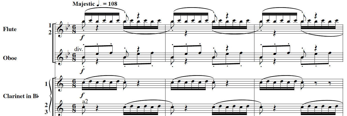 I knew I wanted syncopated brass statements and busy percussion parts, but was initially unsure of what to do with the woodwind voices. I created what I call a sound-screen by scoring repeated two-note fragments alternating in divisi. When properly balanced the result sounds like a written-out trill. The rest of the piece wrote itself over a few busy months of high school band directing.